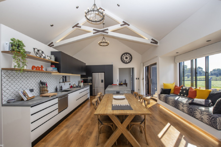 The main living area has a 5.5m apex, with specially sourced tongue and groove effect ply on the raked ceiling, and exposed scissor trusses, with corten gusset joints. It was no mean feat to back light them with hidden LED lighting. A light white colour scheme and minimalist natural-feel furnishings, works perfectly in this “Viking hall” style space.
