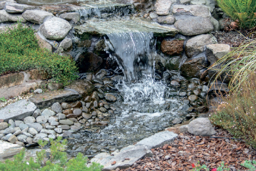 The waterfall feature adds some height to the project, as well as providing a relaxing and calming background sound. Once again, the waterfall shape and construction evolved as Chris worked with the schist and river pebbles.