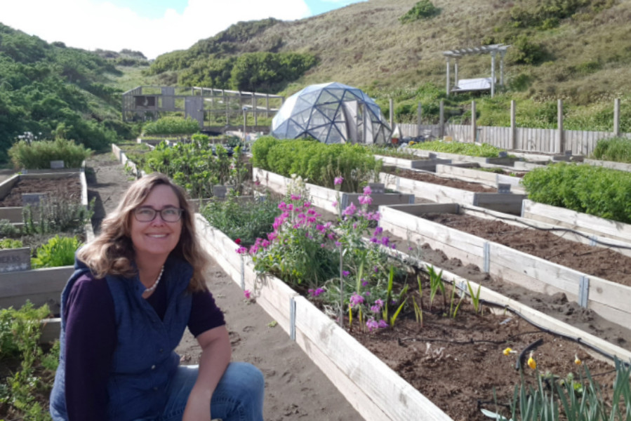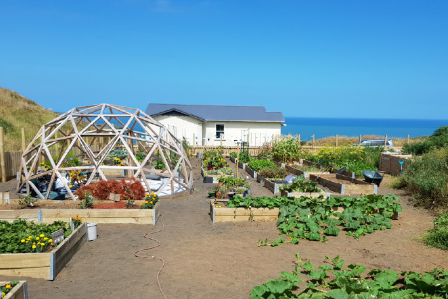 Sarah spent months transforming her coastal block of kikuyu, boxthorn and gorse into her dream garden – 36 raised beds with the main feature a geodesic biodome.