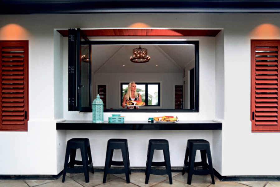 On the exterior, cedar soffits are matched by 90mm Louvre woodgrain aluminium Florida shutters, supplied by Sante Fe Shutters, bringing an authentic cabana aesthetic.