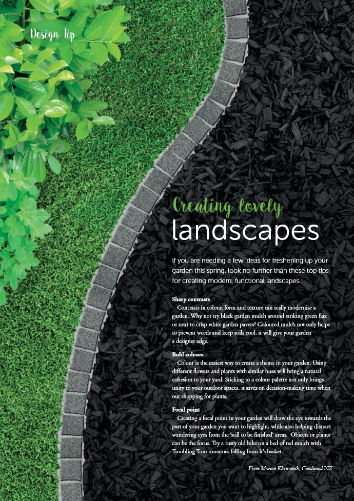 Contrasts in colour, form and texture can really modernise a garden. Why not try black garden mulch around striking green flax or next to crisp white garden pavers? Coloured mulch not only helps to prevent weeds and keep soils cool, it will give your garden a designer edge.